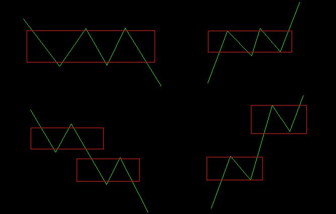 從上圖中,我們還可以看到,輪回套是有3根以上的重疊區的輪回線構成,底部多為輪谷線,頭部多為輪峰線,中間為對峙線。輪回套形成之后,將會有三種情況需要進行面對, 一種就是波動區域的輪回套的延續,一種是輪回套的空間擴展,最后就是脫離該輪回套,形成新的輪回西安趨勢。