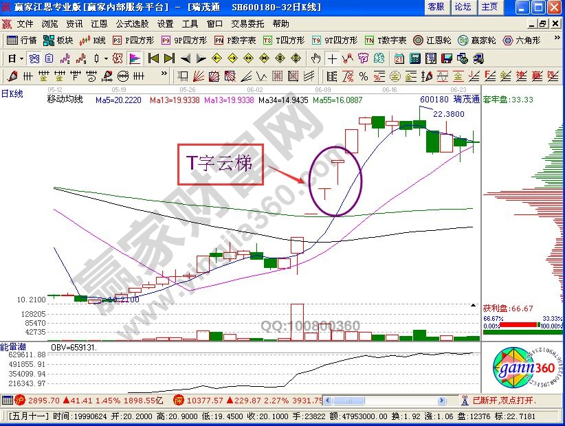 從上圖中,看出,股價在出現T字云梯的時候,股價高開雖然直線下跌,但并未跌破紅色上軌線,而是在紅色外軌線出得到了支撐,所以此時投資者可以繼續只有活著在次日逢低買入!