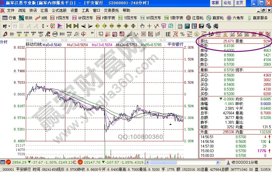 圖中外盤:295336內盤:132328。顯然是外盤數量大于內盤數量,它說明了賣方的力量是比較強的,反之則是說明賣方力量比較強。簡單的來說,外鏈數量大是一個好事。小編有一個習慣就是:外盤價內盤的數量為負數,就選擇觀望,如果差額在不斷的減少直至為零的時候,就是一個非常好的買入時機!當然除了關注外盤和內盤之外,還應當關注委比,如下圖所示。