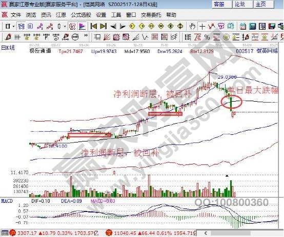 我們來看一個例子,愷英網絡002517,該股在2017年8月28公布半年報時出現將利潤斷層,股價持續以小陰小陽橫盤十幾個交易日后未能形成合力缺口被回補,股價回落到贏家江恩極反通道生命線處獲得支撐展開上攻。