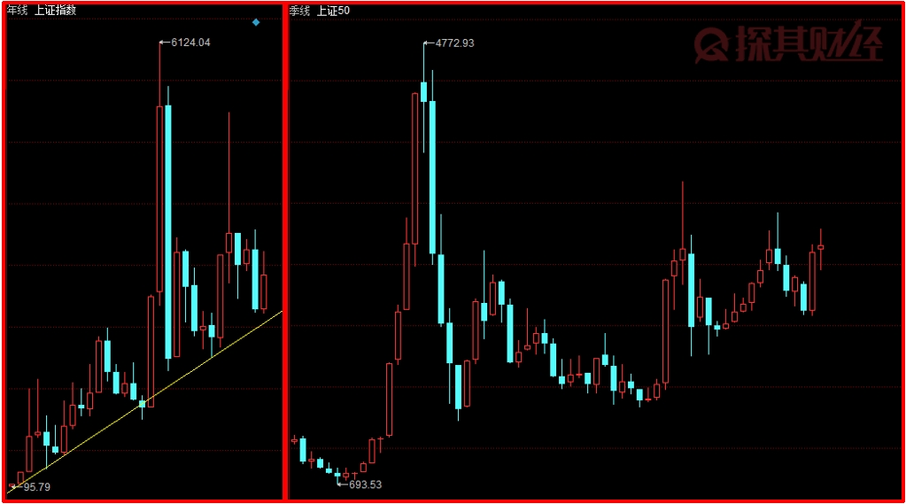 從股市的年線來看,整個上證指數是持續上漲的,而且比較明顯是上證50的指數也比較符合其走勢。所以,編者的觀點也就很明顯了,中國經濟看上證指數可以的,但是也只能看上證50指數,這是因為A股市場的體量在過去持續放大,從老八股到現在的4000余個股,這一系列的變化直接導致了A股市場的擴容。