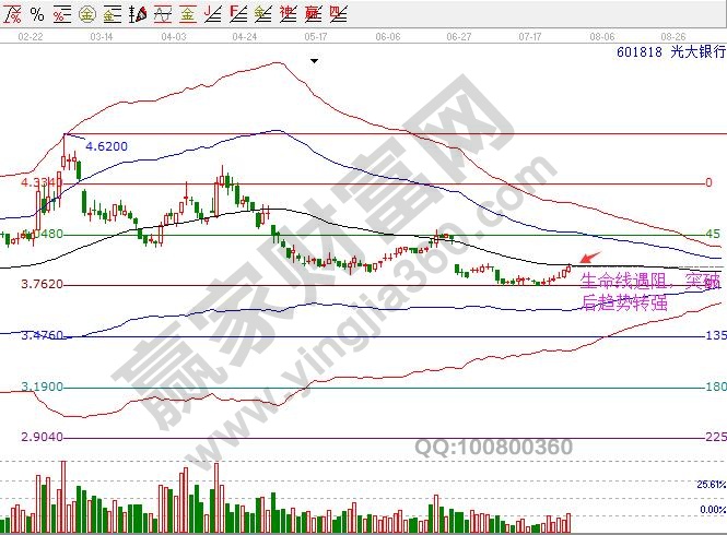 中光大銀行成立于1992年6月18日,在1997年改制成為了股份制有限公司,為客戶提供全面的商業銀行產品與服務。自成立以來,伴隨著中國金融業的發展進程,中國光大銀行不斷開拓創新,銳意進取,在為社會提供優質金融服務的同時,取得了良好的經營業績,在綜合經營、公司業務、國際業務、理財業務、電子銀行業務等方面培育了較強的比較競爭優勢,基本形成了各主要業務條線均衡發展、零售業務貢獻度不斷提升、風險管理逐步完善、創新能力日益增強的經營格局。2010年8月18日,中國光大銀行A股成功上市,迎來又一個嶄新的發展階段。在A股重光大銀行股票代碼出現,為601818。下圖為現在光大銀行現在的技術走勢分析圖,使用的是贏家江恩軟件再現分析方法的圖形,僅供參考,不構成任何投資建議。