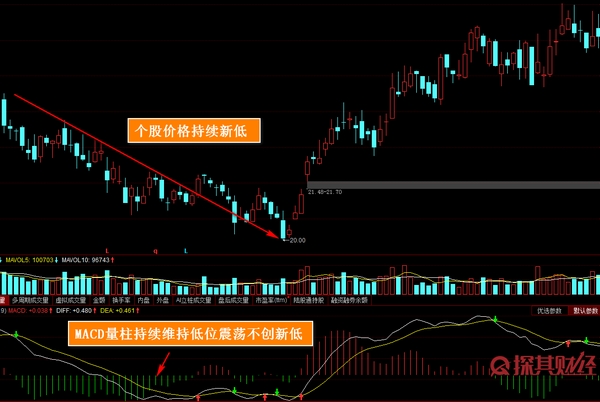 底背離就是指個股在價格持續創新低的時候,指標已經止跌不再新低的情況。簡單來說,就是趨勢雖然還在同向運行,但是強度無疑是減弱了,下跌的加速度已經轉為負數。在實際的技術圖中,該現象也比較明顯,整體呈現出現價格創出新低而快慢線線卻是沒有創出新低,紅綠柱上價格新低但是綠柱縮短,MACD出現了金叉的現象,這就是底背離。