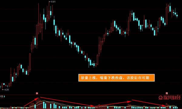 縮量下跌洗盤在技術形態中是極其好辨認的,因為它的走勢就是成交量越來越小,同時K線的長度也是越來越短。這樣的圖形一般都是主力對該股具備極強掌控力的條件下形成的,它的成交量和K線長度在越來越短之后,這時已經是意味著個股已經沒有了拋壓,下方全是密密麻麻的承接盤,所以就能開始上漲。
