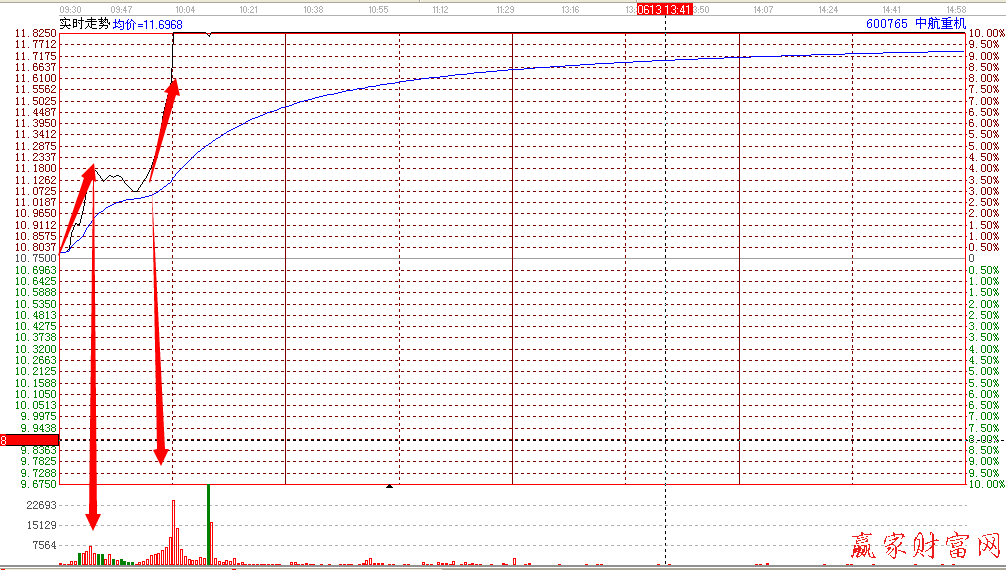600765中航重機屬于航空航天板塊個股,2014年6月12日當天分時走勢中,開盤股價就實現拉升,此時上升角度較大,這一波上漲趨勢非常順滑并且挺拔有力,股價明顯的強勢特征,此時應該就是入場進行短線操作,但是成交量并沒有出現明顯的放大,這一時機很多投資者會錯過。股價的第二波上漲更加凌厲,隨著股價的走高,成交量再次放大,說明盤中資金的追捧力度很大,資金的入場帶來的就是股價的持續走高,分時曲線順滑后市空間較大,短線追漲的最佳時機。