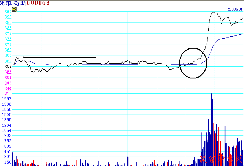 600063皖維高新屬于化工行業板塊,煤化工板塊,在2005年7月1日當天的分時走勢中,我們主要關注的是下午2:10左右,股價開始緩慢向上,突破前期新高成交量配合向上。分時走勢中,往往成交量的放大說明盤中的資金開始積極入場,也是股價上漲的根本動力。原本曲折的分時線變得流暢起來,股價上漲角度變大,說明上漲勢頭強勁。