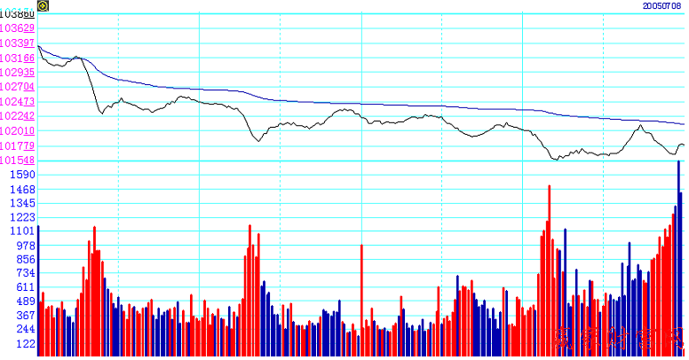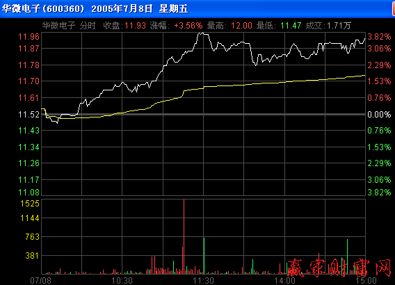 :仍然以2005年7月8日當天上證指數分時走勢為背景,個股我們選取600360華微電子。華微電子屬于電子元件板塊,當天股價在開盤后隨指數的下跌出現小幅的向下震蕩,股價下跌幅度小于指數下跌幅度。后期,指數弱勢震蕩時,每一次小的反彈對應股價的是一個快速的上漲。指數出現殺跌時,對應的股價一般進行短時間的調整。股價能夠在盤中形成逆勢操作是因為盤中主動資金在積極運作,股價才可以在指數下跌的時候不斷上漲。逆勢走高,如果漲幅不是很大,每一次上漲創出新高都是投資者的買入機會。