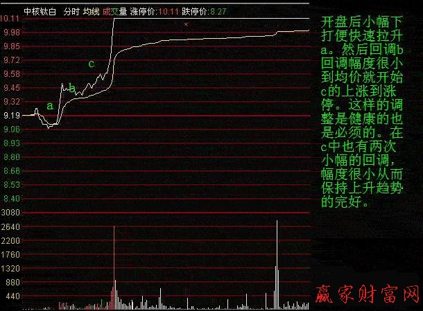 市場在運行過程中,出現調整是正常的也是必須的。調整是指在市場拉升過程中,出現的短暫或小幅度的下跌或在某個區間內波動運行的狀態,即常說的回調和橫盤。但有一點投資者必須要記住:調整就是調整,它并不能改變市場原有運行趨勢,這是調整的前提。也就是說,調整是為了市場更好的展開拉升,而非改變上升趨勢。如果說回調是一種弱勢調整,那么橫盤是一種強勢調整,下面結合中的分時圖簡要分析。