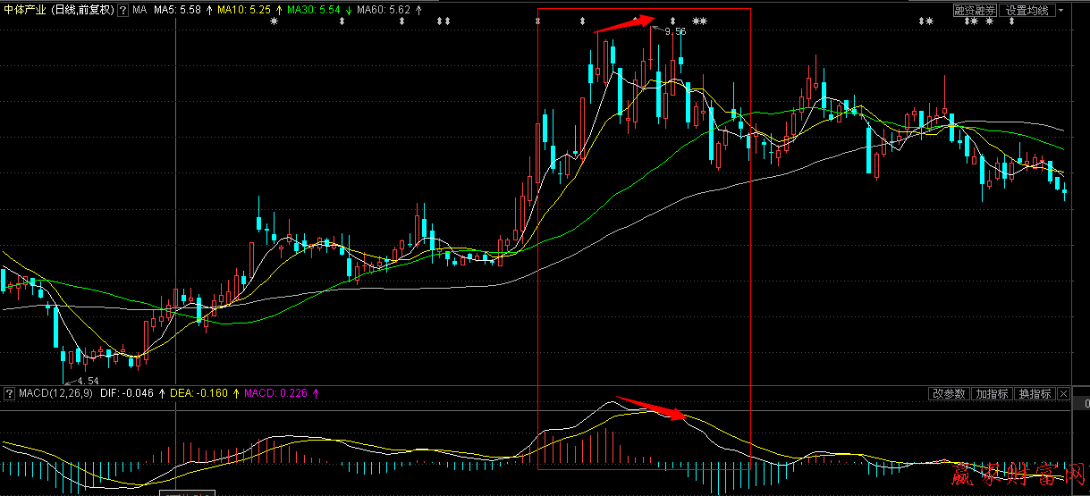 600158中體產業屬于房地產板塊個股,前期一波拉升到2013年10月11日出現9.46的高點,短期橫盤出現回落。之后進入平臺整理,股價回落之后出現一個9.58的新高點,實現突破。此時看MACD指標,沒有及時反映,趨勢向下,所以MACD與均價線出現頂背離情形,市場見頂信號,建議出局觀望。