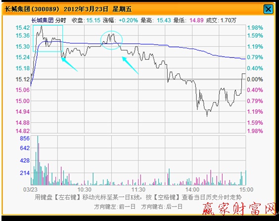 ? ? ? ? 上圖是分時圖走勢形態的壓力作用,這是分時圖技術的難點之一。也是我們學習時需要注意的一點。所謂分時圖走勢形態的壓力作用,是指分時圖走勢在某一個時間節點上形成了某種形態之后,隨后的走勢往往受到它的壓制,股價運行到它的附近時, 會出現回落。