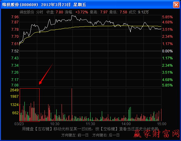 上午第二時間段密集放量上漲是最常見的操盤定式,是現象中最經典的主力操盤手法之一。上午第二時間段是最重要的做盤時間之窗,是主力操縱股價的最理想的時間節點。如下圖: