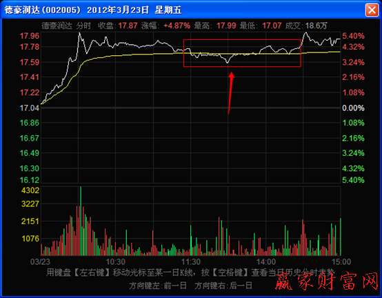2.如果盤中的分時圖角度很大,超過了700甚至更大,那么除非是直奔板而去,并牢牢封住,否則,沖高回落的概率就很大,此時應當擇機減倉。