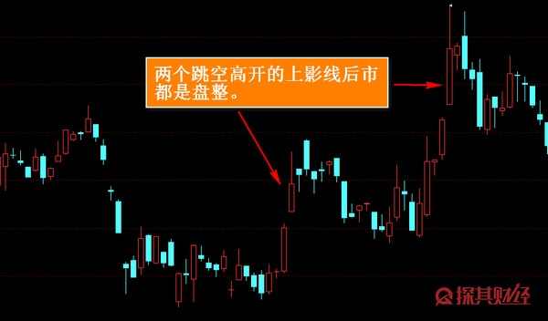 如上圖所示,下方的那一根跳空高開的上影線很明顯是資金介入所帶來的,而上方的那一根則是因為莊家拉高出貨而帶來的。