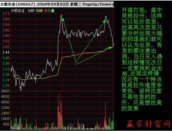 3.低開盤中突然拉升到高位回落并出現大量,事實上.這是莊家故意做出來的,目的就是為了引起投資者關注,利于莊家出貨,如下圖。