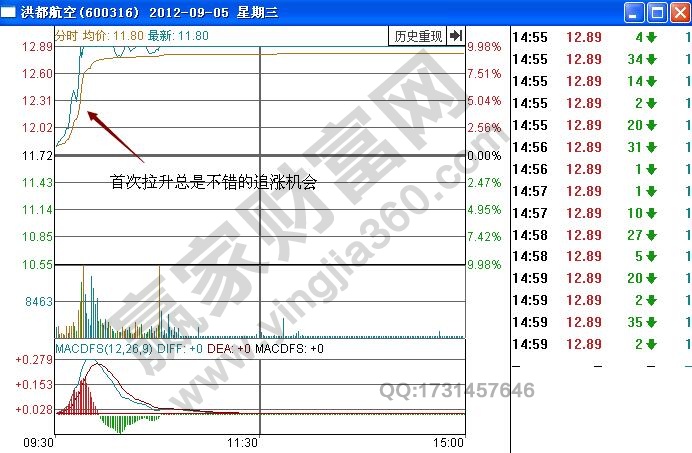 從洪都航空的分時圖中可以看出,股價開盤階段的放量漲停板僅僅用兩波漲停,說明主力拉升該股的力度很強,但是股價并沒有封死漲停價,(由贏家財富網編輯,轉載請注明出處,www.yingjia360.com)而在盤中出現了長達37分鐘的打開漲停價的走勢,說明價格高位的拋售還是很強的,影響到該股持續反彈的走勢。