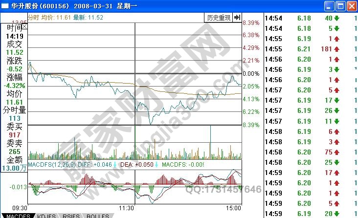如圖所示,華升股份在2008年3月31日的分時走勢圖的變化,從圖中可以看出有大量的賣單砸在了6元左右的股價,(來源于贏家財富網,轉載請注明出處,www.yingjia360.com)而最后一筆砸盤的目的是機構可以打壓做盤,其目的是吸引市場眼球的注意,讓跟風盤進場幫忙抬升股價。由此可以看出,明天的股價必然會出現高開的形態。