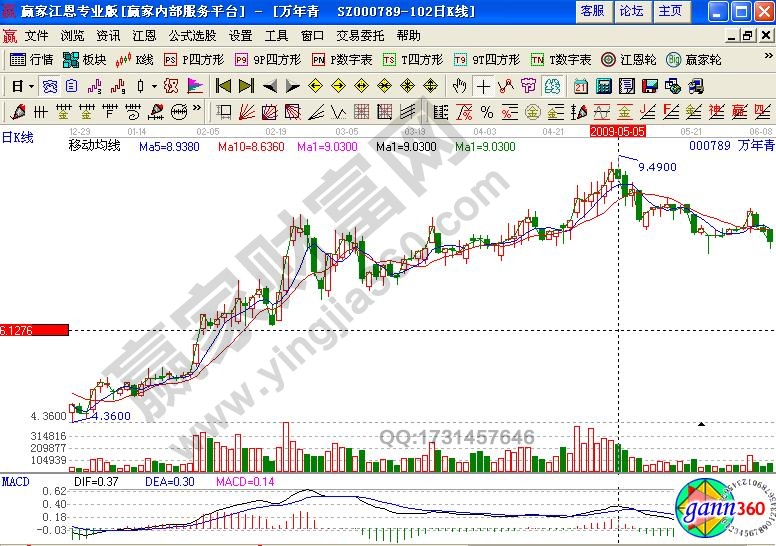 比如說萬年青在2009年出現的對倒出貨動作,(來源于贏家財富網,轉載請注明出處,www.yingjia360.com)表明水泥板塊開始有大量的資金拋棄,有回調開始下跌的趨勢,這個時候投資者應該注意回避出貨風險。如圖萬年青從4.36元的股價低位上漲到9元的高價區域,這個時候投資者應該及時的分析賣出的時間和點位。