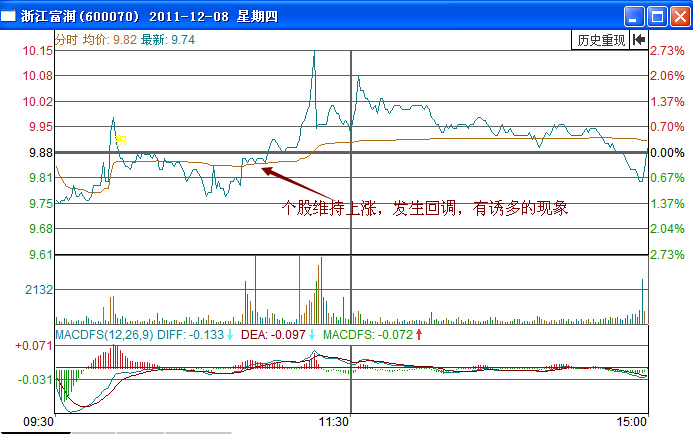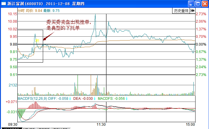 浙江富潤(600070)在2011年12月8日的股價走勢中,可以首先分析該股的分時走勢圖,對比委買盤和委賣盤中的掛單數量的變化,是明顯的下托單,(由贏家財富網編輯,轉載請注明出處,www.yingjia360.com)這一盤口信息說明是主力常見的誘多行為,投資者要細心觀察股價的變化,尋找有利的盈利點位。