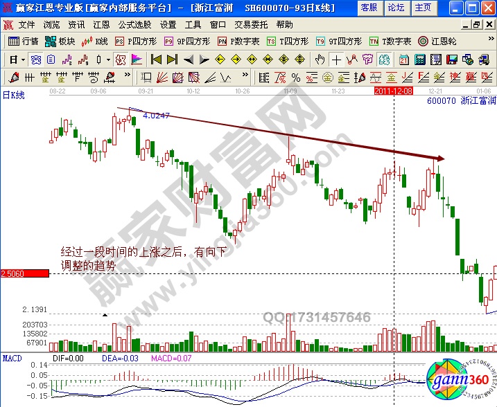 同樣觀察其日線的走勢圖可以看出,當該股經過一波上漲之后,已經運行到壓力線的附近,具有了向下調整的條件。