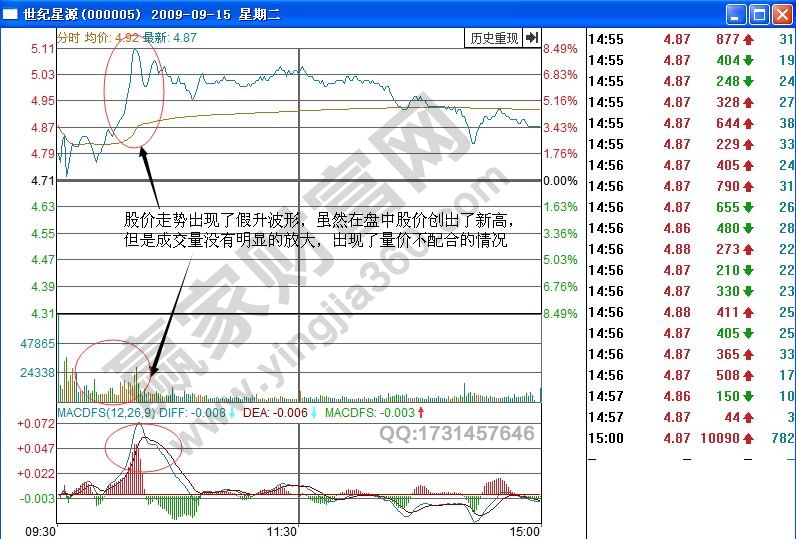 實例如世紀星源在2009年9月15日的分時走勢變化,從中可以看出形成了向上拉升的波形,但是在股價上漲的過程中,已經創出的新高,但是觀察其成交量的變化,發現量能萎縮,而且在分時圖中的量峰結構也顯示該股拉升中的量價不配合形態,說明該股這個時候的拉升波形很可能是由于主力對敲拉升股價形成的假升波形態。