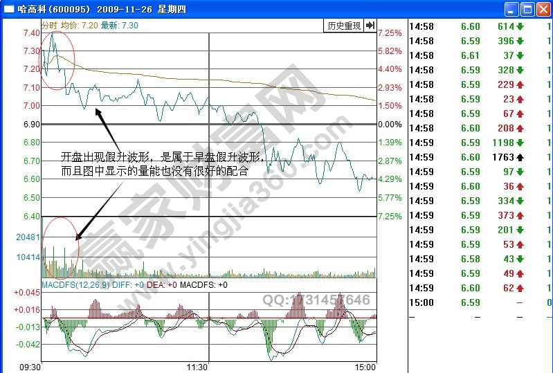觀察哈高科(600095)在2009年11月26日的分時走勢形態,可以看出在早盤中形成了假升波形態,研判的標準是,在股價經過一個較大波段的拉升之后,早盤開盤股價向上沖高,上升幅度高達3%左右,之后見頂回落,在盤中持續的震蕩盤跌,在分時圖中的顯示就是成交量出現大單形態,而且量峰的峰值呈現橫向放大的特征,縱向的高度比較小,缺乏上漲的力度,而且分時線和均價線一直處于下跌的趨勢中,這個時候投資者要做的就是持幣觀望。