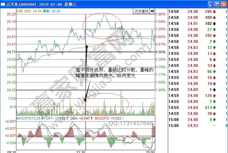 盤中假升波的形態具有的識別特點包含:在股價拉升之前沒有出現溫和放量的現象,而且可以看出在買賣盤口出現了較少的大單或特大單委托的現象,還有就是盤口成交量會顯示出單筆大單或多筆大單,如圖云天化(600096)在2010年1月6日的分時圖走勢,可以看出形成了盤中假升波的波形,而且該股的量峰峰值在開始的時候呈現的是橫向放大的特征,之后迅速萎縮,縱向的高度較小,量能形態也呈現了稀松不緊湊的特點,所以投資者在操作中要注意回避風險,做好資金控制。