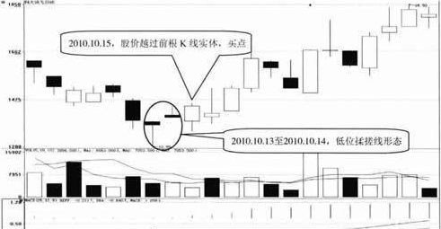 低位揉搓線出現之后,第二個交易日,若股價繼續上漲,越過前根K線實體(等于開盤價和收盤價),則買點出現。