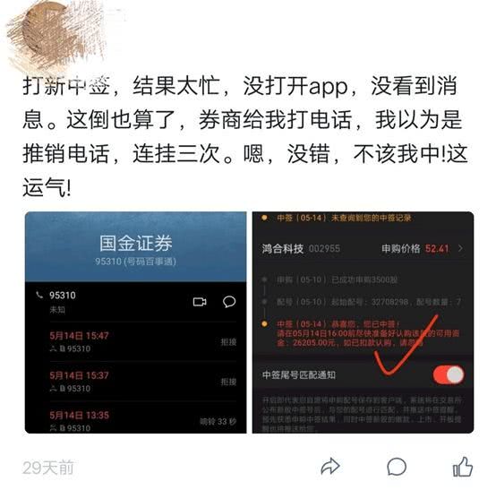 下面這位朋友就是這樣,在5月份的時候打新中簽鴻合科技,結果因為太忙,沒看中簽情況,券商打電話通知,當成是推銷電話給掛斷了,結果沒有繳款,白白浪費了中簽的機會。這只股是深市的股,發行價格52.41元,中一簽就是26205元,上市后漲到83.02元,500股就是41510元,一個不小心就白白丟了15305元。