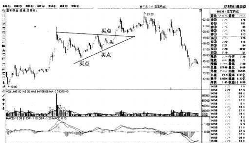 (2)成交量逐漸萎縮,在整理的尾端才逐漸放大并以巨量沖破頂與頂的連線。