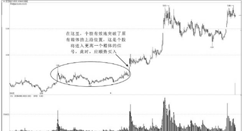 當原有箱體的上沿被有效突破后,個股就將進入一個更高的新箱體中運行,反之,當原有箱體的下沿被有效跌破之后,個股就將進入一個更低的新箱體中運行。依據箱體理論的思想,股民應在個股有效地突破箱體上沿位置后買股入場,享受新一輪升勢所帶來的利潤。