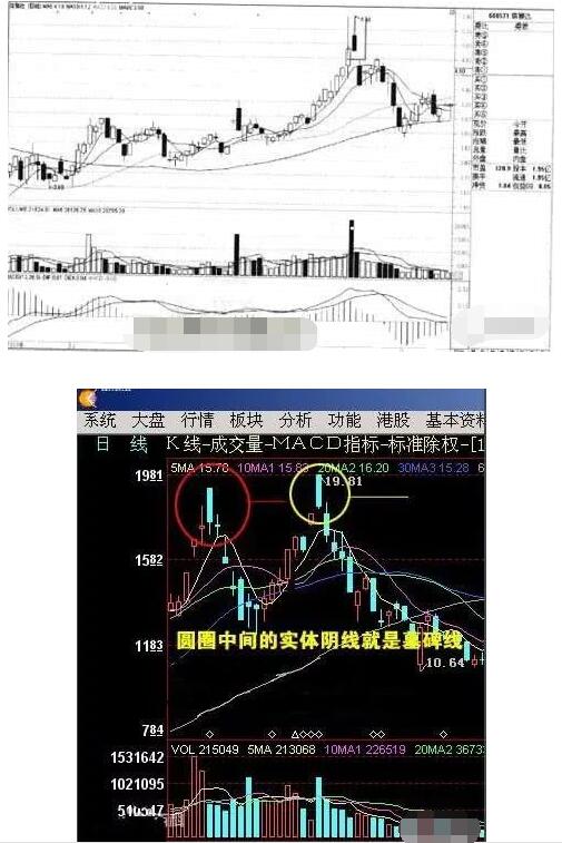 2.對于組成“墓碑線”的大陽線與大陰線在成交量上沒有要求,若大陽線與大陰線同時放量形態意義更強。