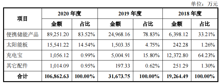 從產品結構來看,華寶新能的主要產品為不同容量規格的便攜儲能產品及充電寶,以及可與便攜儲能產品配套發電的板及相關配件。其中,便攜儲能產品為公司的核心產品,2018年-2020年,銷售金額分別為6,398.12萬元、2.5億元和8.93億元,占營收比例分別為33.21%、78.83%和83.52%;太陽能板2020年占營收比例達14.54%;2020年二者占比超98%。產品結構較為單一,若公司產品所在領域出現市場價格不可逆的大幅度下降等不利影響,且公司未能推出新產品并有效拓展市場,則公司將面臨業績波動較大的風險。