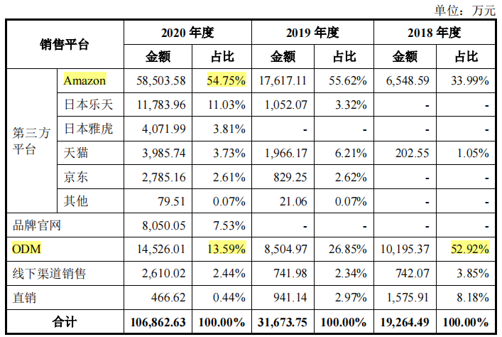 公司主要通過線上銷售平臺開展業務,線上銷售占比由2018年的37.14%上升到2020年的85.6%。報告期內公司通過亞馬遜、天貓、京東、日本樂天和日本雅虎等國內外第三方電商平臺開展的線上銷售的銷售額占主營業務收入比重分別為35.04%、67.83%和75.99%。