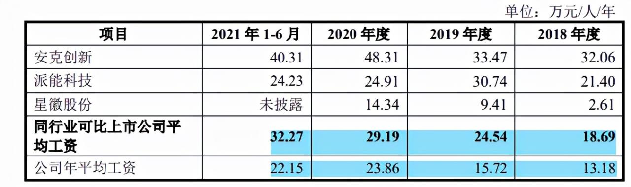 報告期內,華寶新能的研發費用占當期營業收入的比例分別為4.22%、3.25%、2.82%和2.29%,顯一路下降的趨勢,對比一下,可比同行的平均值則在4.27%、4.97%、4.74%和4.97%,而華寶新能研發人員的平均工資均低于同行業可比上市公司平均值。