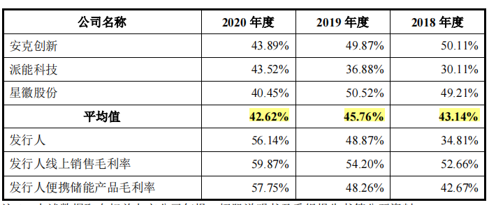 報告期內,華寶新能綜合毛利率分別為33.02%、48.66%和56.10%,一路攀升,2020年較2018年毛利率上升23.08%。2018年,公司主營業務毛利率水平略低于可比公司的平均水平,主要系當期公司以線下ODM模式為主,相關銷售模式毛利率較低所致;2019年及2020年,公司主營業務毛利率水平高于可比公司的平均水平,主要原因得益于公司構建了集研發、生產、品牌、銷售于一體的全價值鏈經營的M2C模式,使公司獲得了更高的產品毛利率。同行可比公司毛利率平均值在42%-26%之間,特別是2020年公司的毛利率高出同行均值十幾個百分點。