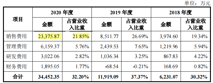 報告期內,華寶新能銷售費用分別為3,974.60萬元、8,511.77萬元和2.34億元,銷售費用率分別為19.34%、26.69%和21.85%。其中,銷售平臺費用分別達到899.28萬元、2,865.04萬元、1.05億元。