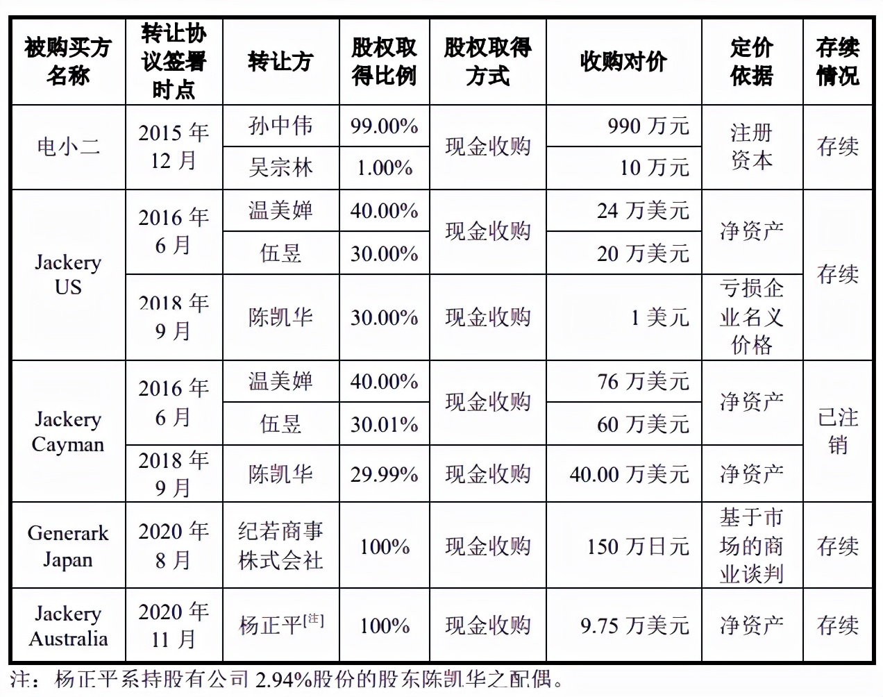此外,公司為了在日本市場提前布局家庭儲能產品業務,于2020年8月從紀若商事株式會社處收購了株式會社Housedog的全部股權,并將其名稱變更為“株式會社Generark Energy”,擬后續在日本市場推出家庭儲能產品;公司為進一步開拓澳洲的便攜儲能市場,于2020年 11 月從楊正平處收購Jackery Australia的全部股權,楊正平系持有公司2.94%股權的股東陳凱華之配偶。