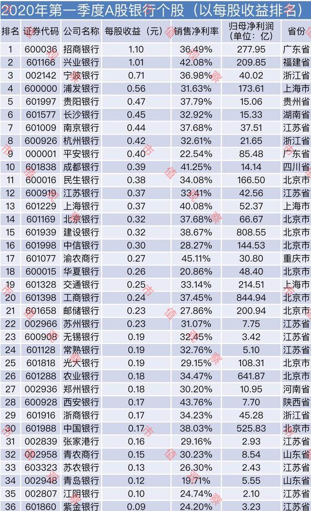 從每股收益來看,第一季度A股銀行個股每股收益超過1元的有2家,分別是(600036)1.10元、(601166)1.01元;每股收益在0.5-1元之間的有2家,分別是(002142)0.71元、(600000)0.56元;在0.2-0.5元之間的有17家,分別是(601997)0.47元、(601577)0.45元、(601009)0.44元、(600926)0.42元、(000001)0.40元、(601838)0.39元、(600016)0.38元、(600919)0.37元、(601229)0.37元、(601169)0.32元、(601939)0.32元、(601998)0.30元、(601077)0.27元、(600015)0.26元、(601328)0.25元、(601398)0.24元、(601658)0.23元、(002966)0.23元。