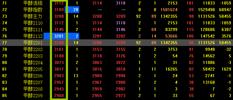 當前甲醇主力合約為甲醇2201,最新價格是3208元每噸。