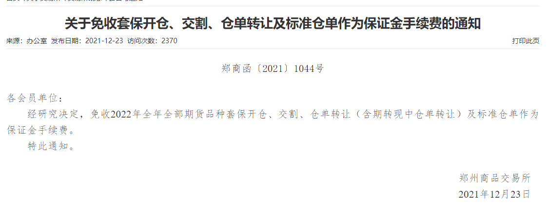 2022年不僅會上市新的期貨交易品種,同時鄭商所在12月23日也發布了關于2022年期貨全部品種套保開倉、交割、倉單轉讓等手續費免收的通告。