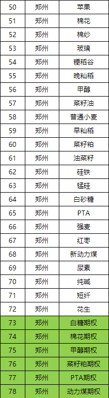 鄭州商品交易所(7個):白糖(SR)、PTA(TA)、棉花(CF)、強麥(WS)、硬麥(WT)、秈稻(ER)、菜油(RO)?