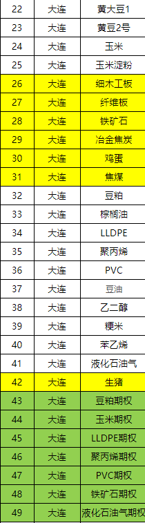 大連商品交易所(8個):豆一(A)、豆粕(M)、豆油(Y)、玉米(C)、棕櫚油(P)、LLDPE(塑料)(L)、PVC(V)、豆二(B)