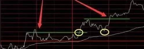 這與第5種情況相反,這是屬于分時的突破進行強阻力。一個臺階后上一個臺階,跟第三種支撐做多的情況比較接近。買點有兩種,一種是剛剛突破平臺的黃色框突破的位置,一種是突破后的回踩平臺位置。也要注意不要進行追高。