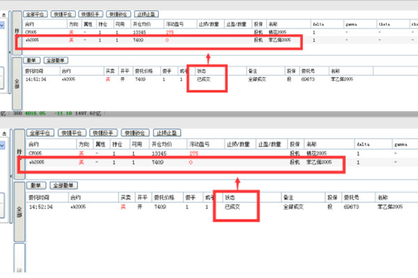 之后,一旦交易成功就會在持倉中顯示,相對應的,此時委托欄中此合約的狀態就變成了“已成交”。