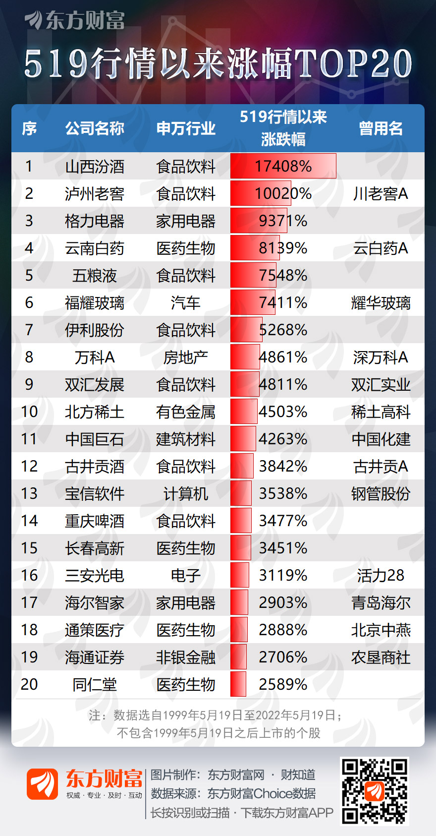 具體看,山西汾酒、瀘州老窖、格力電器、云南白藥和五糧液累計漲幅位居前五,漲幅依次17408%、10020%、9371%、8139%和7548%,其中,山西汾酒和瀘州老窖更是實現了股價超100倍的暴增!