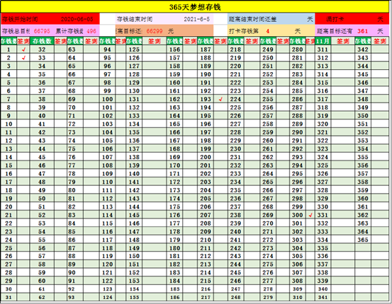 有了這個夢想做支撐那么攢錢就有了儀式感,每天起床第一件事把需要攢的錢轉入到夢想賬戶。轉完一筆在表格里打勾做好記錄。