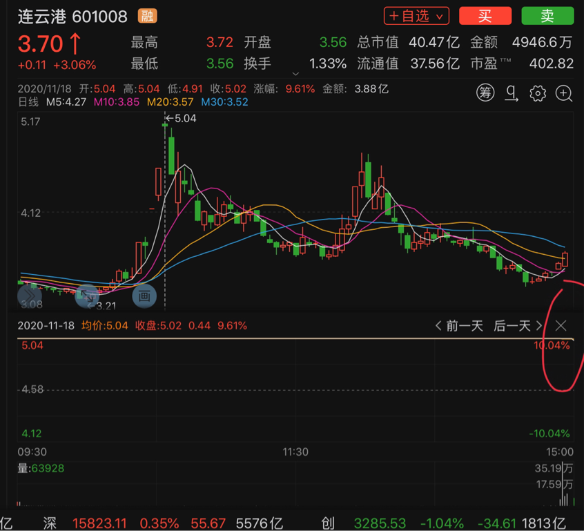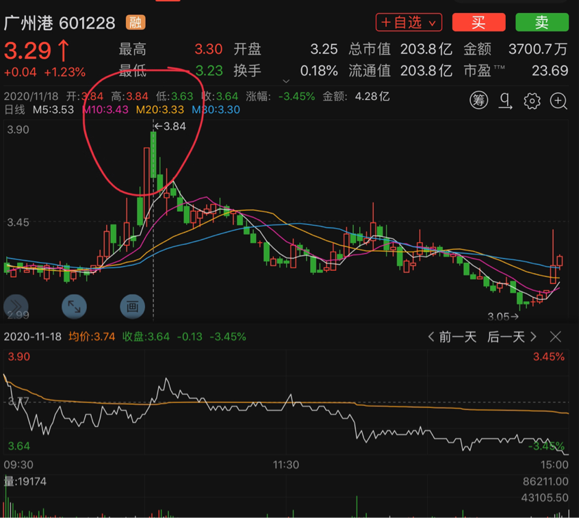 典型如下圖的廣州港,漲停次日競價只有3個點,當天全天走弱,短線回調幅度比較大。