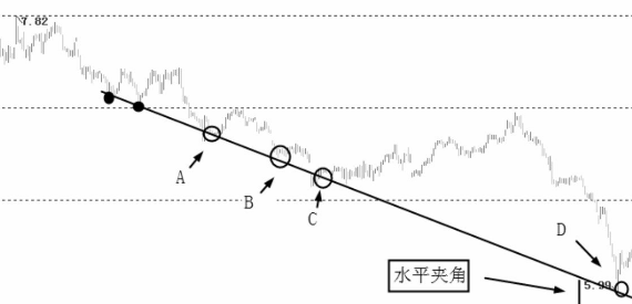 下跌趨勢中,如圖中這種水平夾角較大,下跌支撐線較陡峭的情況,一般支撐線都較難被打破,當股價下跌至該線附近時,都能獲得短期支撐引發反彈。如圖中A、B、C、D等處,都是短線操作的搶反彈買點。