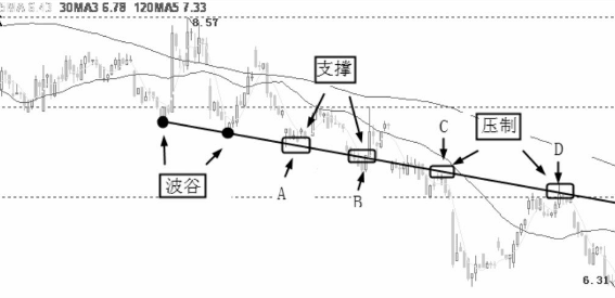 下跌支撐線是指股價在下跌趨勢中,前一波谷與后一波谷低點之間的連接直線,這條方向向下的直線就叫下跌支撐線。