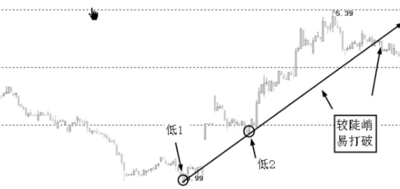 上圖中,由波谷低1和波谷低2構成的上升支撐線較為陡峭,則這種較陡峭的趨勢線一般容易被破壞。